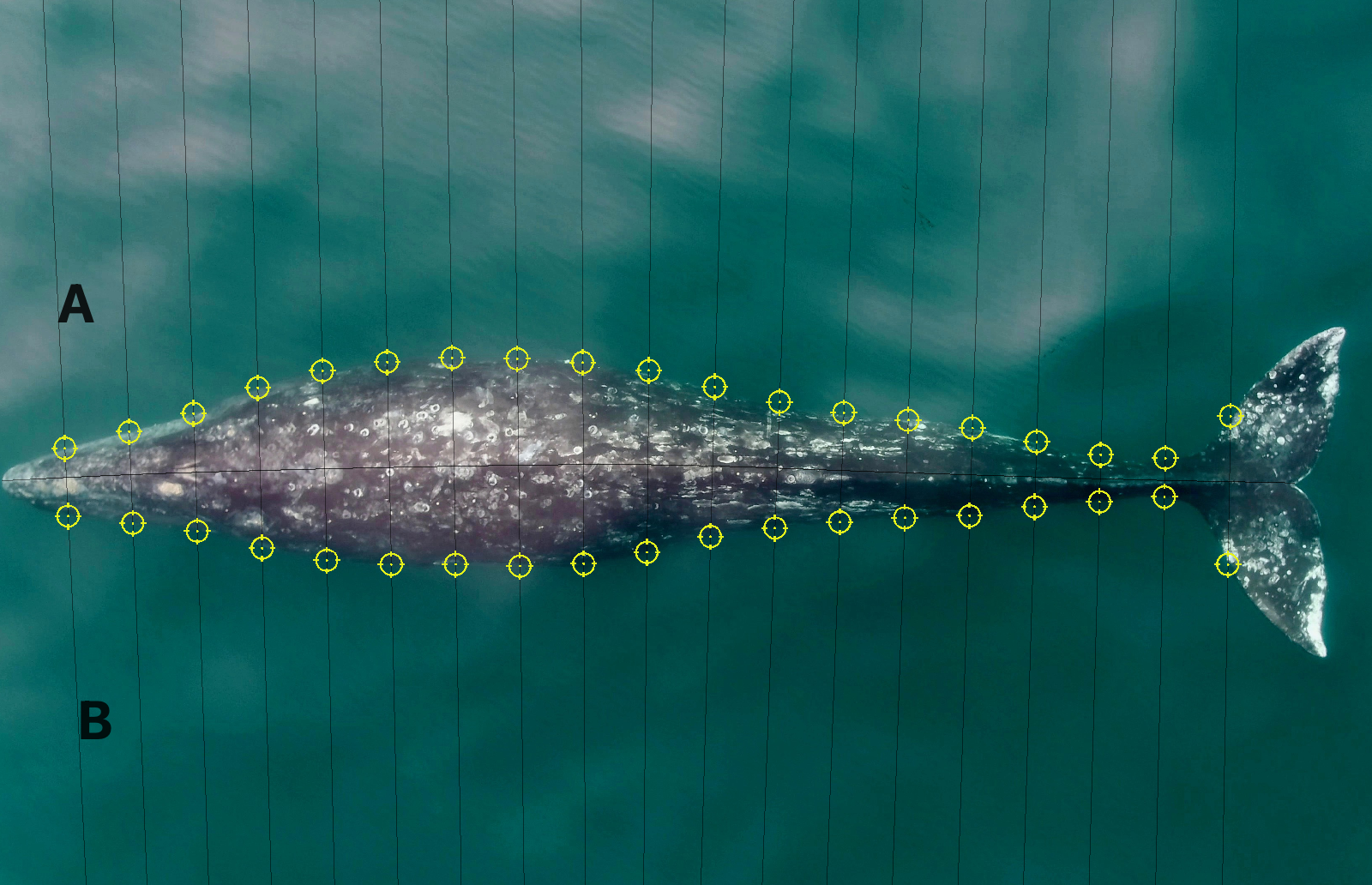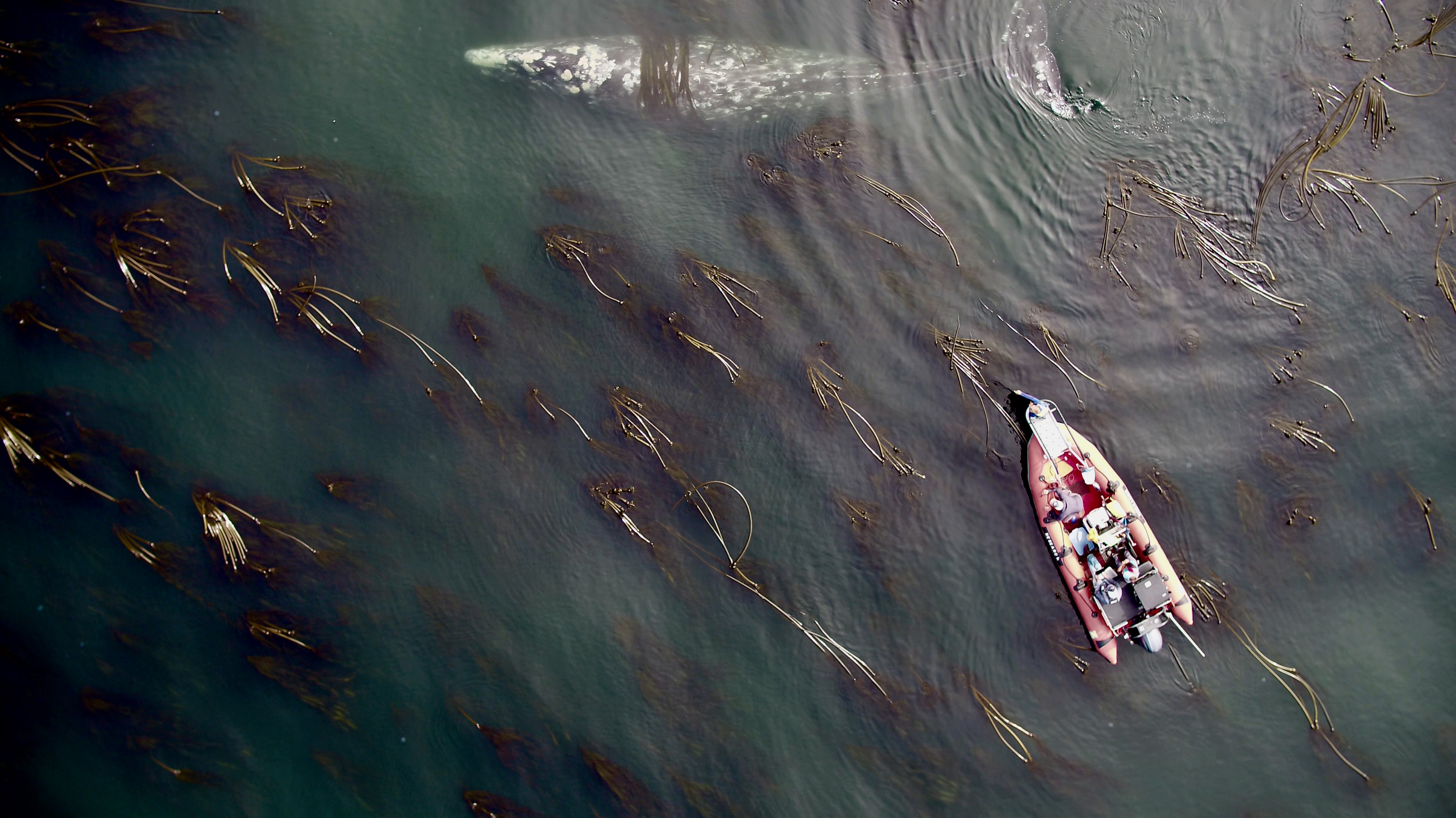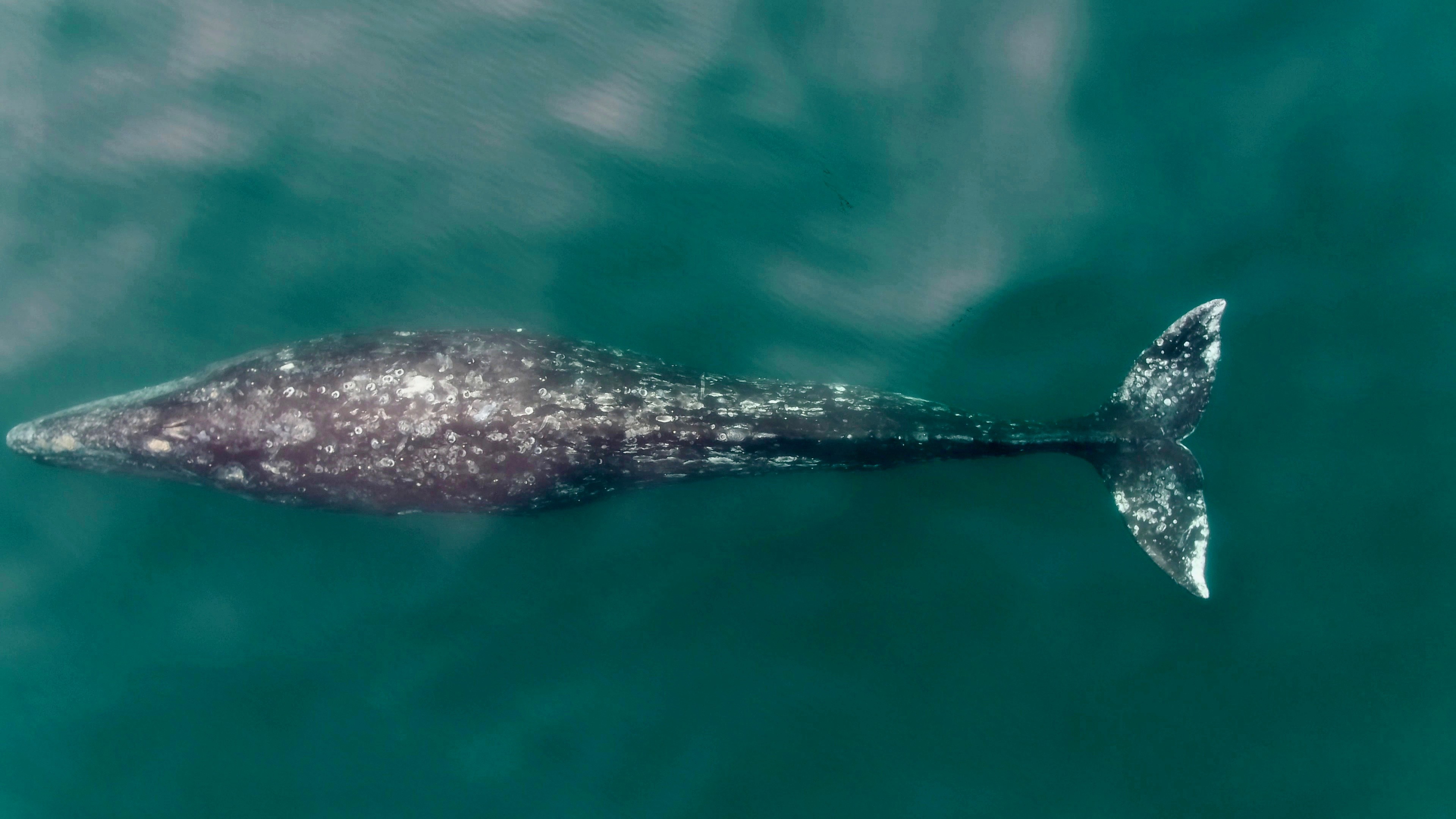 Photos of grey whales from drone footage by Kevin C. Bierlich